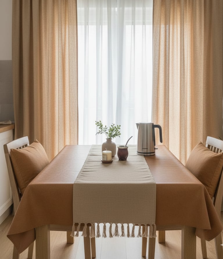 Incluye mantel y camino combinados en tonos tierra, junto con almohadones que aportan armonía y confort. Ideal para quienes buscan un estilo natural, relajado y con detalles que invitan a quedarse un rato más en la mesa ☕✨